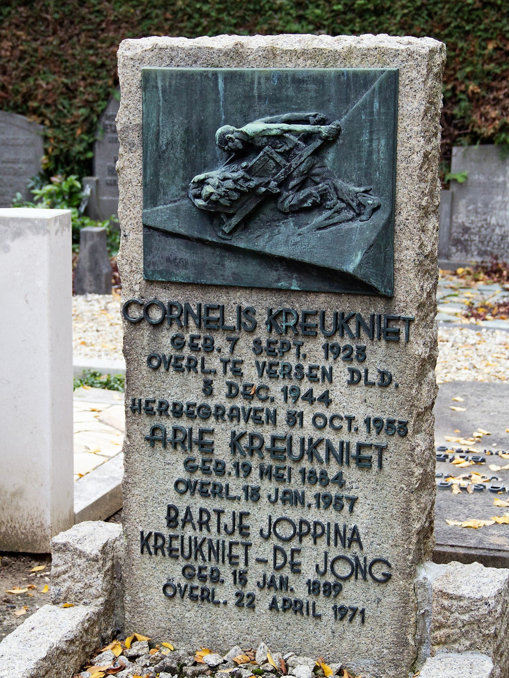 Er zijn van zijn hand ook aan de oorlogstijd herinnerende grafmonumenten, één daarvan is dit monument op de oude Algem. Begraafplaats in Gorinchem. Cornelis Kreukniet kwam om door dwangarbeid.
