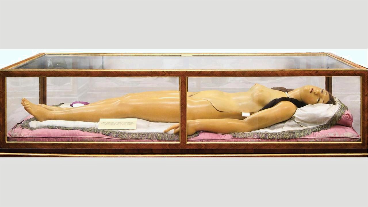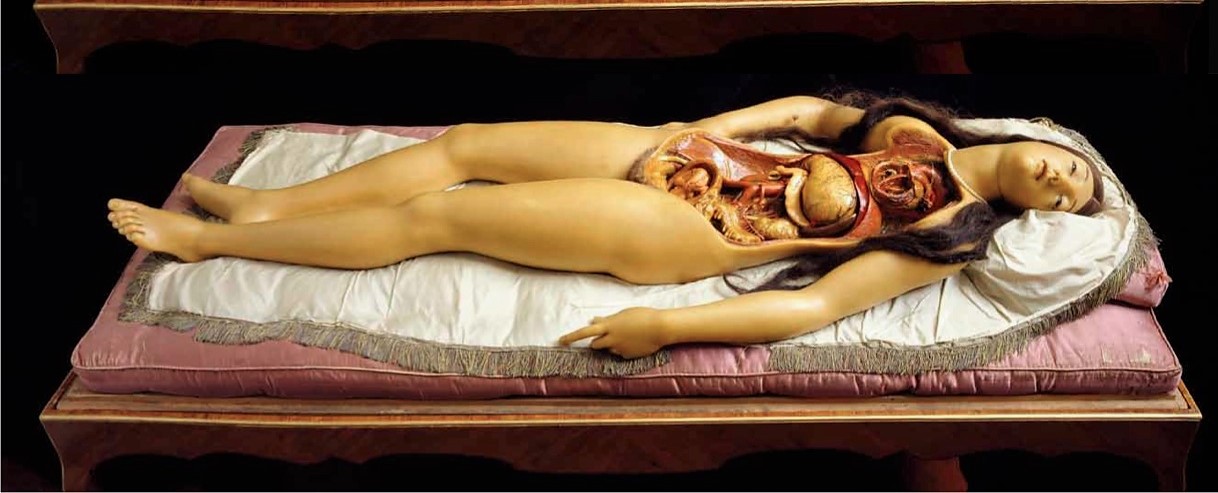 De romp van de Medici Venus, la Specola, slapend als Doornroosje in een glazen vitrine in het Zoölogisch museum in Florence, kan in delen worden opengeklapt om medische studenten een kijkje te geven in haar binnenste.