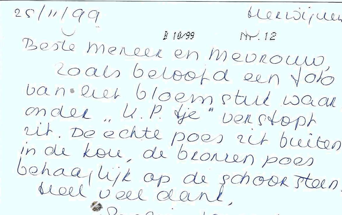 De eigenaar van de poes wilde graag kennis maken en het atelier en de beeldentuin bekijken. Op de afgesproken dag en uur belde ze aan. Ik stond t.o. een kleine tengere vrouw die in haar handen klapte en zei : ‘Wat ben ik blij dat ik u gevonden heb.’
